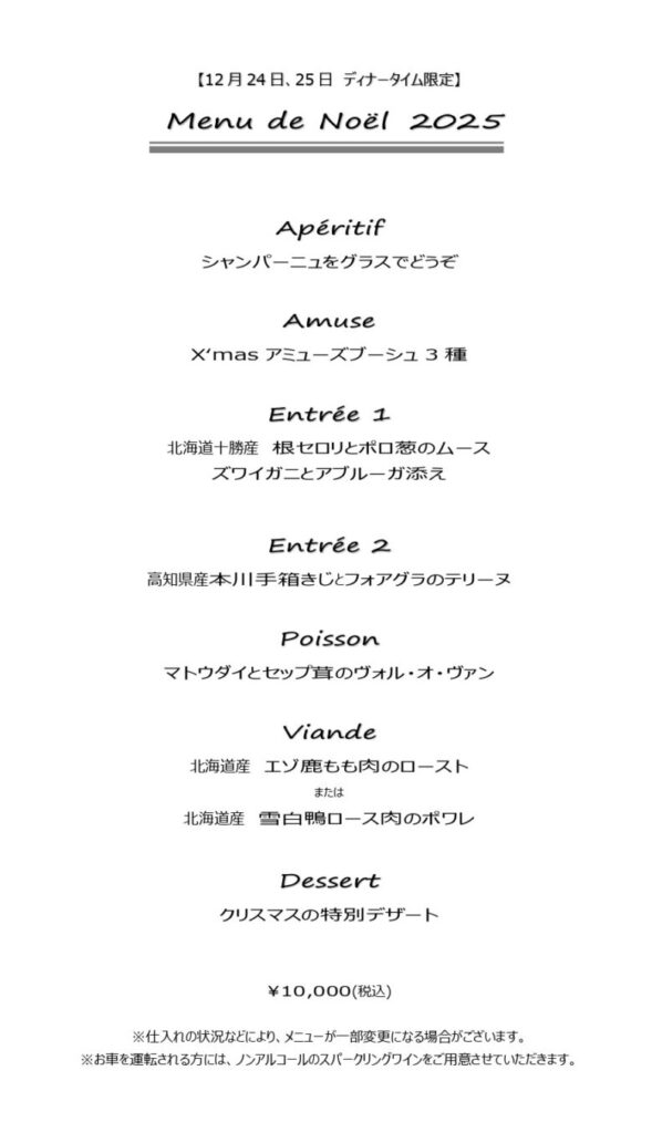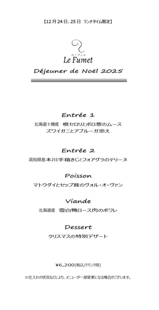 クリスマス特別メニュー提供の2日間は「クリスマス特別メニュー」のみのご提供となり、通常メニューはお休みします。アレルギーや苦手食材への対応もいたしかねます。