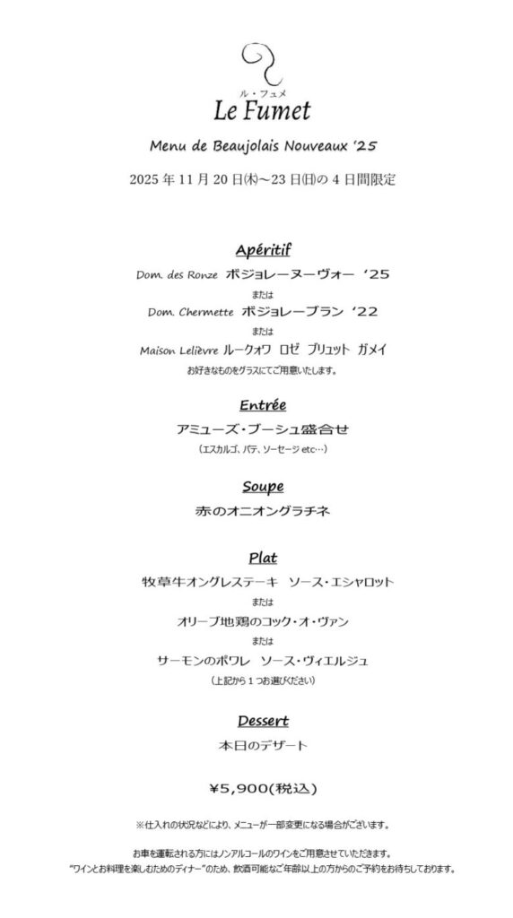 ル・フュメでは、今年もボジョレーヌーヴォー解禁を祝う特別なディナーをご用意いたします。